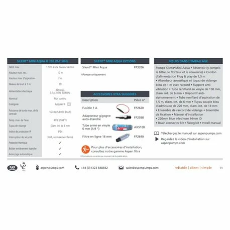 Combinant la technologie Silent+ à la pompe la plus fine du marché, la pompe Silent+ Mini Aqua de chez Aspen est à la pointe de l’innovation. Ultra-discrète, elle possède un absorbateur acoustique et un dispositif anti-siphonemment qui fait d’elle la plus silencieuse de sa catégorie. Ses dimensions sont de 165 x 28 x 28 mm (HxLxP) et son poids de 180 g. Débit max : 12 litres / heure. Hauteur de refoulement : 10 mètres. Référence : FP3326. Code produit : 157AS00246. Code EAN : 5060144981455.