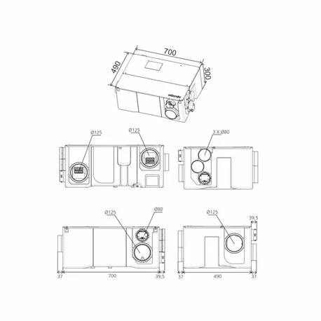 Voici les mesures de la référence pour préparer la pose : une largeur de 700 mm, une hauteur de 300 mm et une profondeur de 490 mm. A propos du diamètre, nous avons 80/125 mm et un poids de 15 kg.