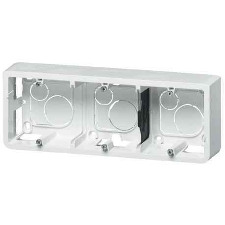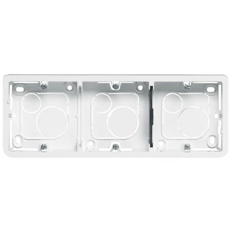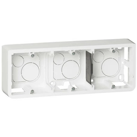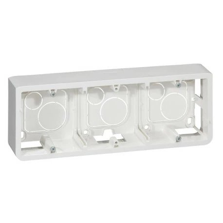 Cadre saillie triple P40 de la marque Legrand. Les dimensions (lxHxp) sont : 225x83x40 mm. Ce produit dispose de trois postes qui peut comprendre 6, 8 ou 3×3 modules. L’installation se fait en saillie et la fixation par vis. Ce cadre est certifié NF et CE. Référence : 080286. Code EAN : 3245060802868.