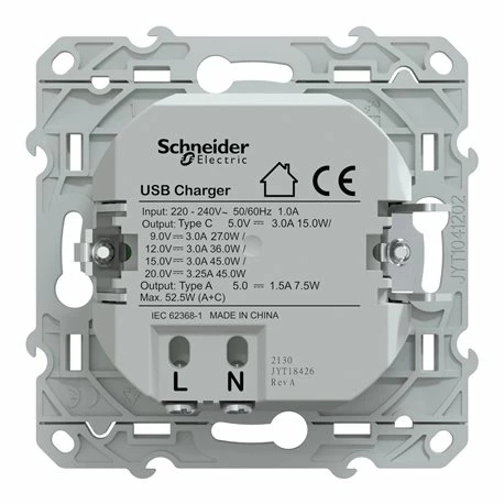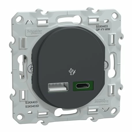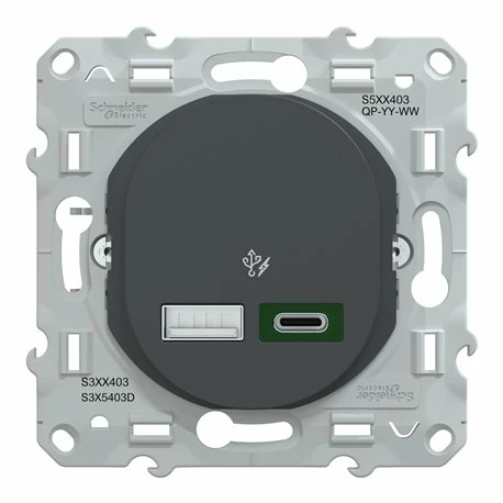 Chargeur USB type A 7,5W + type C 45W Ovalis S340403 Anthracite Schneider Electric. Il permet d’alimenter smartphones, ordinateurs portables et tablettes. Son faible encombrement offre une meilleure facilité de câblage. Ce chargeur USB est conforme à la directive CEE sur la baisse des chargeurs mobiles et l’harmonisation du standard de recharge de terminaux portables à partir de 2024. Il s’installe dans une boîte d’encastrement type multi-postes ou simple 71 ou 57 mm. Ce produit est garanti Green Premium, l’écolabel qui s’engage à des performances durables et respectueuses de l’environnement. Plaque de finition vendue séparément. Code EAN: 3606482162921. L’ensemble des spécifications du produit se trouve dans l’onglet notices ci-dessous. La référence est également certifiée Cradle to Cradle® valable au niveau international, Schneider Electric doit respecter les exigences en matière de gestion de l’eau et du carbone, d’énergies renouvelables, de composition et de réutilisation des matériaux ainsi que de l’équité sociale.