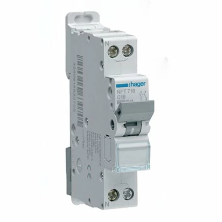 Disjoncteur 1P+N 6-10kA courbe C 16A 1 module de la marque Hager. Les dimensions (lxHxP) sont : 17,7×84,7×70 mm. Il est à encastrer avec des fixations encliquetables. Son pouvoir de coupure est à 6 kA. Il dispose d’un pôle Phase + Neutre. Ce produit est certifié NF EN 60898-1. Il est possible d’associer ce produit avec des gammes 1P+N, 3P et 3P+N sous une même barre de pontage. Pour former votre disjoncteur différentiel, il vous suffit d’ajouter le disjoncteur réf.BFH225F ou BFC225F ou BDH225F ou BDC225F en accessoires du produit. Référence : NFT716. Code EAN : 3250614630705