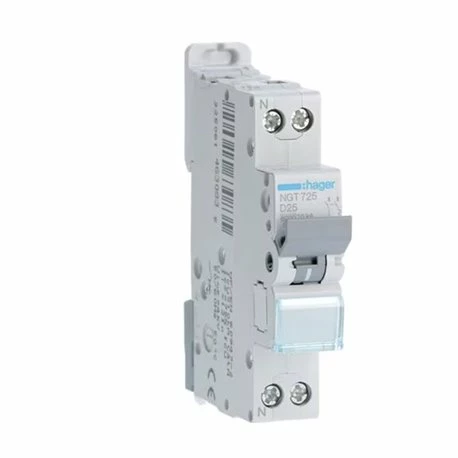 Disjoncteur NGT 725 Hager 1P+N 6-10 kA courbe D (spécialement conçu pour les clims), profondeur encastrement 70 mm, 2 pôles, tension 4kV, 1 pôle protégé, classe protection IP20, calibre 25 A, tension 240 V, fréquence 50-60 Hz, courbe D, tension isolement assignée 500 V, section de raccordement câble rigide 0,75 mm² et section de conducteur connectable multifilaire 0,75 mm², code EAN: 3250614630835