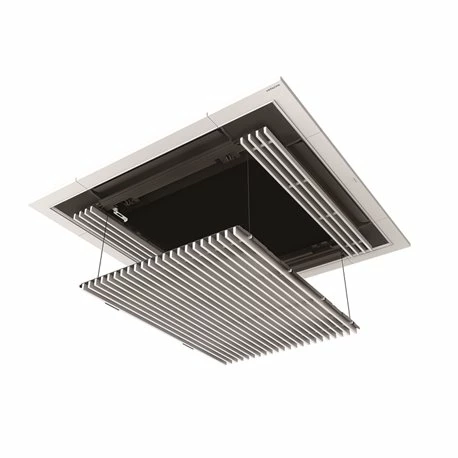Façade Silent-Iconic avec grille ascenceur de la marque Hitachi. La présence d’une grille ascenceur permet un abaissement de la façade jusqu’à 4 mètres, permettant ainsi un nettoyage Conçue pour s’intégrer parfaitement dans les espaces au design subtil et contemporain, cette façade possède un design unique. La présence d’une grille ascenceur Son installation est facile et le confort d’utilisation est garanti. Ce modèle, de coloris blanc, mesure 950x52x950 mm et pèse 6,5 kg. Compatible avec les cassettes 800×800 mm Hitachi. Référence : P-GP160NAPU-EU.