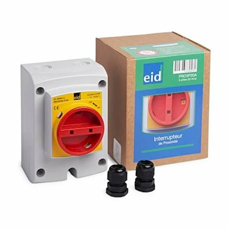 Interrupteur de proximité PRO4P20A 4 pôles 20 A EID , obligatoires sur tous les groupes extérieurs selon décret actuel : D.2010-1118 : Nouvelle protection des travailleurs contre les risques électriques. 50-60Hz. 3 phases + terre + neutre. IP66 pour une installation en extérieur. Cadenassable en position ‘OFF’ avec 2 cadenas. Cadenassable en position ‘ON’ avec 1 cadenas. Compatible avec la norme IEC 60947-3. Diamètre d’entrée câble : 12 mm, pré perçage pour câbles: 4, presse -étoupe fourni : 2. Installation facile grâce à la platine arrière amovible avec niveau. Fixation murale avec ou sans la platine arrière. Interrupteur amovible pour faciliter le câblage. Code EAN: 3700396862585