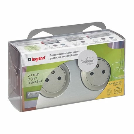 Double prise de courant Céliane Surface avec plaque de coloris aluminium, complet, de la marque Legrand.