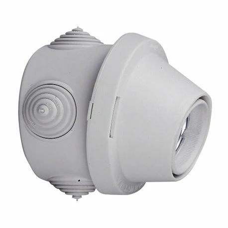 Douille patere Plexo patère E27 orientable de la marque Legrand. Modèle : Support de lampe en saillie. Produit fait en Céramique de couleur gris. IP20. Classe II. Avec 4 embouts à entrées directes pour montage droit ou incliné. Connexion sur borne à vis Référence : 060152. Code EAN : 3245060601522.