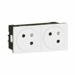 Prise de courant double 2P+T surface blanc Mosaïc de la marque Legrand. Les dimensions (lxHxP) sont : 90x45x40 mm. Ce produit possède une intensité de 16 ampères, en ce qui concerne la tension nominale elle est de 250V. Référence : 077142L. Code EAN : 3414971576384.