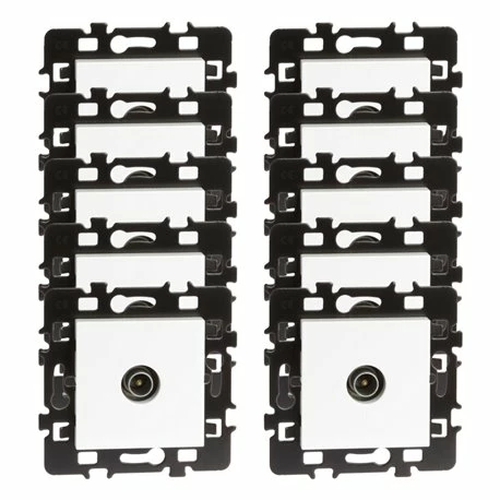 Le Lot de 10 prises TV Simple Blanc 61864 Eur’ohm est une prise avec une fréquence TV de 470-790 MHz. Encastrable et de couleur Blanc, elle s’adapte parfaitement à votre intérieur. Elle possède un connecteur TV mâle. Elle s’installe en Encastré. Elle convient pour les installations hertziennes et satellite avec un démodulateur individuel. Le raccordement se fait par une borne automatique et un blindage métal. Compatible avec la TNT. Code EAN : 3663752026789