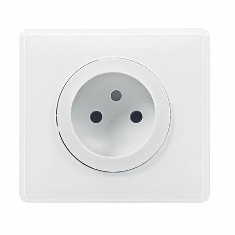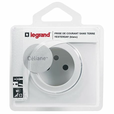 Prise de courant sans terre complet avec plaque Celiane de la marque Legrand. Les dimensions (lxHxP) sont : 90x82x8,5 mm. De coloris blanc, en plastique.